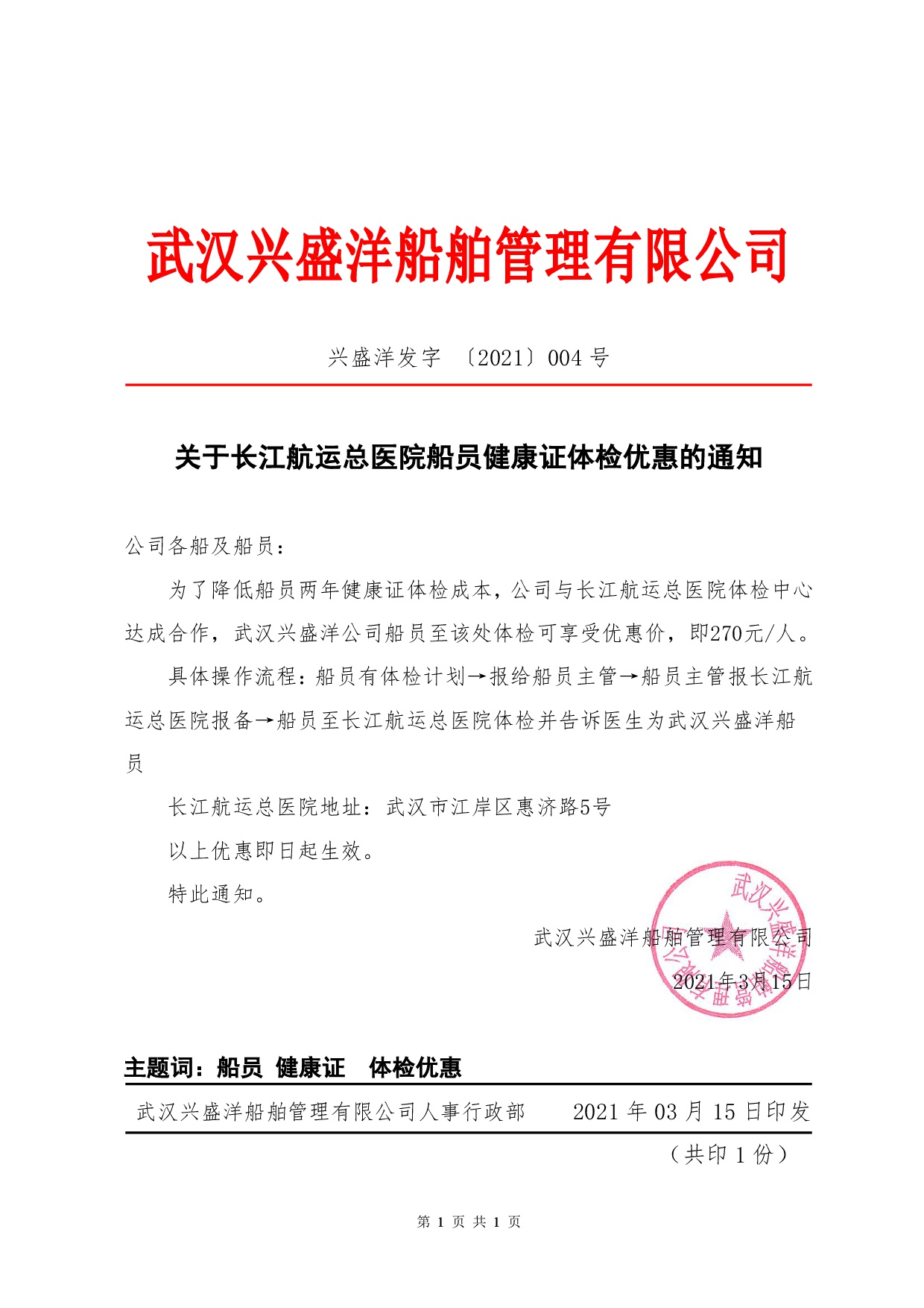 關于長江航運總醫(yī)院船員健康證體檢優(yōu)惠的通知